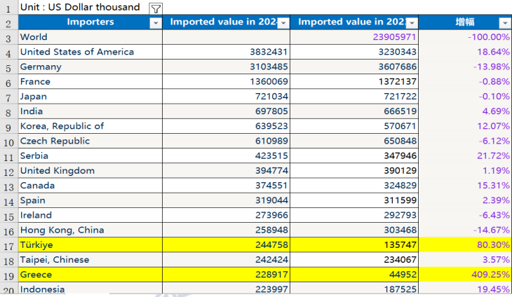 1. 通過整體數(shù)據(jù)看,歐盟包括澳洲發(fā)達國家的進口是整體下降的,但歐洲有幾個國家的增幅非常亮眼,出現(xiàn)了幾倍的增長,包括希臘 409.2%,愛沙尼亞 117%,土耳其 80%。