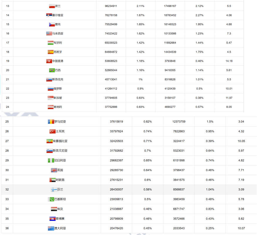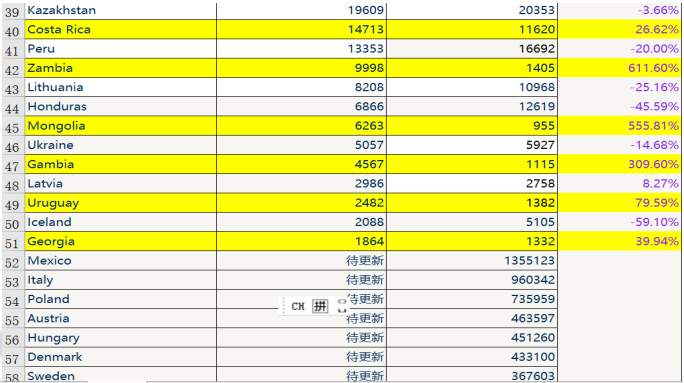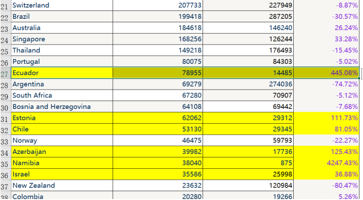3. 南美的厄瓜多爾,智利,烏拉圭、哥斯達黎加均出現(xiàn)了不俗的表現(xiàn),尤其厄瓜多爾增長幅度 445%。