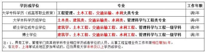 具有工程技術(shù)或工程經(jīng)濟(jì)專業(yè)大專以上(含大專)學(xué)歷,并符合下列條件之一者,可申請參加監(jiān)理工程師執(zhí)業(yè)資格考試。