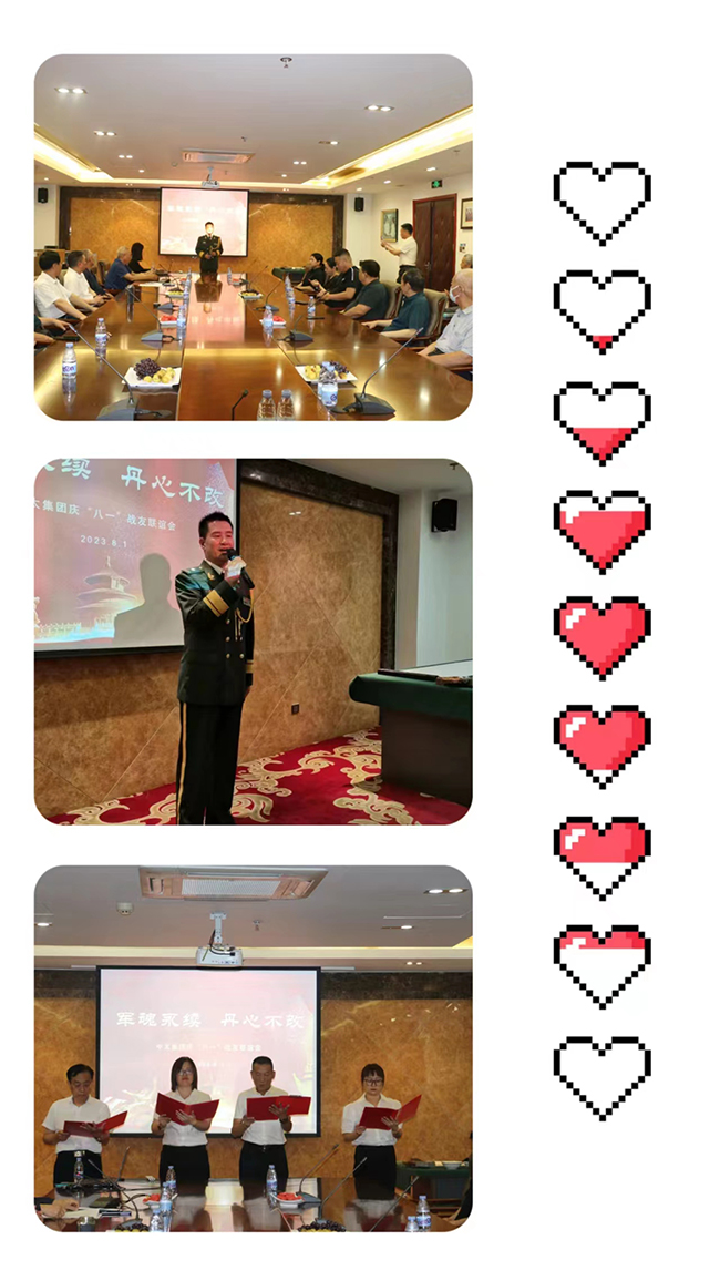 2023年8月1日,中太集團(tuán)舉辦了慶祝中國(guó)人民解放軍建軍96周年戰(zhàn)友聯(lián)誼活動(dòng)。展示軍人精神面貌,增進(jìn)戰(zhàn)友深厚情誼,傳承部隊(duì)光榮傳統(tǒng),進(jìn)一步弘揚(yáng)中太優(yōu)良文化,營(yíng)造積極向上的良好氛圍。活動(dòng)由一段詩歌朗誦《戰(zhàn)友是什么》拉開序幕;退伍軍人獨(dú)唱了軍旅歌曲《軍人本色》、《再見大別山》和《兒行千里》;老戰(zhàn)友現(xiàn)場(chǎng)揮灑筆墨“軍魂永續(xù)、丹心不改”;活動(dòng)中老首長(zhǎng)踴躍發(fā)言,講了建軍節(jié)的意義,部隊(duì)軍轉(zhuǎn)工的發(fā)展歷程;中太投資控股集團(tuán)董事局主席李文健作了《軍魂永續(xù) 丹心不改》的重要講話。