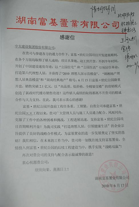 感謝信中說,6月15日,富基.世紀(jì)公園隆重開盤,銷售突破2.1億元,這些驕人成績(jī)都離不開中太集團(tuán)的精誠合作與大力支持。同時(shí)他們表示,雙方將在項(xiàng)目的后續(xù)工程建設(shè)中,相互支持,攜手實(shí)現(xiàn)“戰(zhàn)略雙贏”。 |
