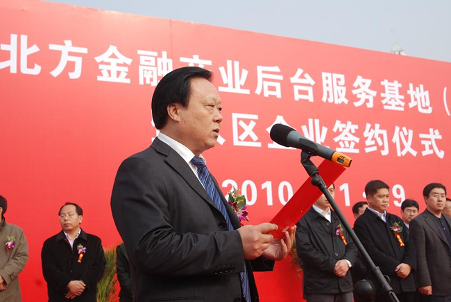 11月19日,經(jīng)河北省人民政府批準(zhǔn),河北省“中國北方金融產(chǎn)業(yè)后臺服務(wù)基地(A區(qū))”在中太現(xiàn)代服務(wù)業(yè)基地正式掛牌。省長助理、省金融辦主任江波、廊坊市市委書記趙世洪出席揭牌及入?yún)^(qū)項目簽約儀式并為基地揭牌。市長王愛民講話。市政府常務(wù)副市長吳立方、市委常委、組織部長范永錄等省市縣相關(guān)部門領(lǐng)導(dǎo)出席儀式。揭牌儀式由永清縣委書記布澤文主持。