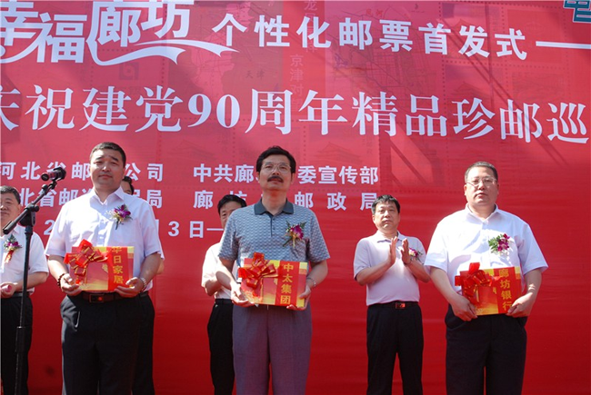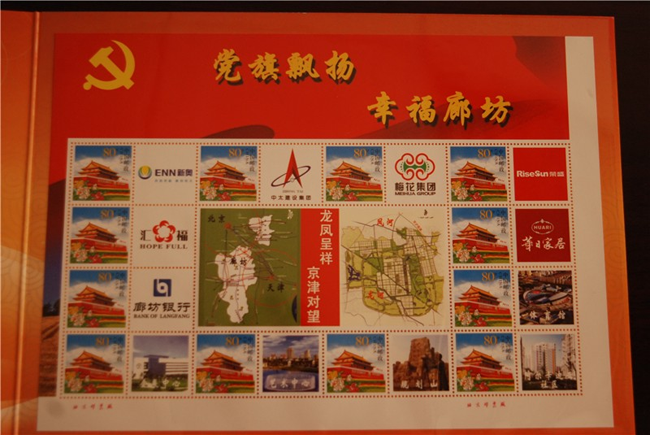 6月3日上午,由廊坊市委宣傳部與廊坊市郵政局共同推出的《黨旗飄揚(yáng) 幸福廊坊》個(gè)性化郵票在廊坊市博物館舉行首發(fā)式!饵h旗飄揚(yáng)·幸福廊坊》個(gè)性化郵票共“1+12”幅圖案!1”即中心主圖案,體現(xiàn)廊坊市“龍鳳呈祥,京津?qū)ν钡膮^(qū)位優(yōu)勢(shì),“12”即12幅輔圖,其中4幅分別為會(huì)展中心、居民小區(qū)、文化藝術(shù)中心、中央生態(tài)城,體現(xiàn)“智能、生態(tài)、商務(wù)、休閑”的廊坊