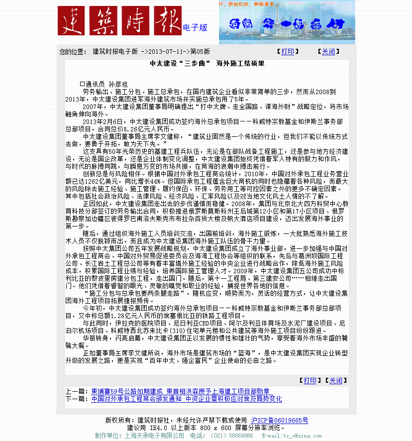 《建筑時報》7月11日第五版報道了中太建設(shè)集團進軍海外市場結(jié)碩果