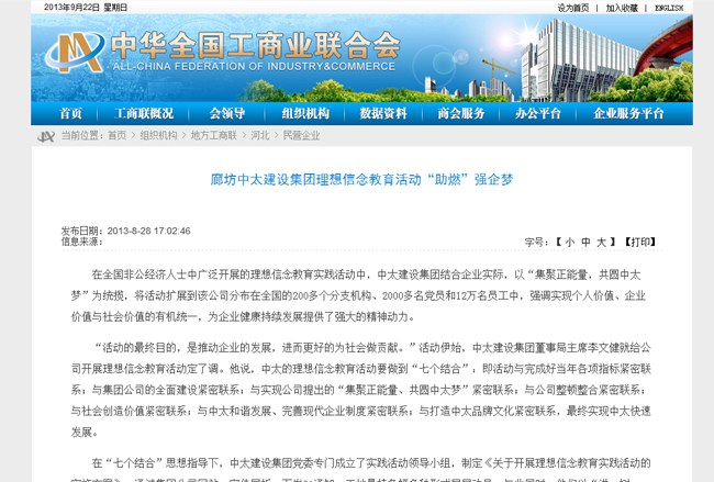 工商聯(lián)網(wǎng)站8月28日?qǐng)?bào)道了中太建設(shè)集團(tuán)理想信念教育活動(dòng)“助燃”強(qiáng)企夢(mèng)