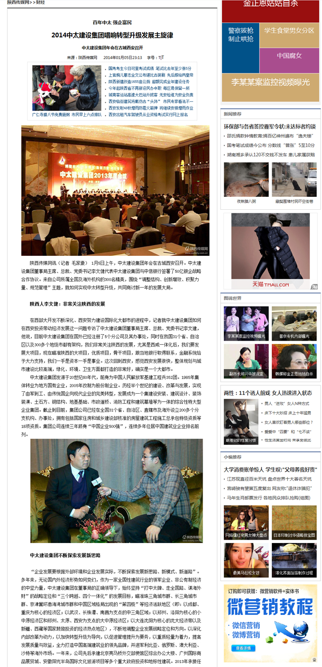 陜西傳媒網(wǎng)2014年01月05日報(bào)道了2014中太建設(shè)集團(tuán)唱響轉(zhuǎn)型升級發(fā)展主旋律