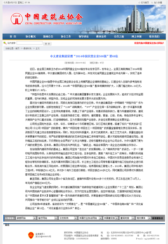 中國建筑業(yè)協(xié)會(huì)報(bào)道了中太建設(shè)集團(tuán)榮膺“2014中國民營企業(yè)500強(qiáng)”第68位
