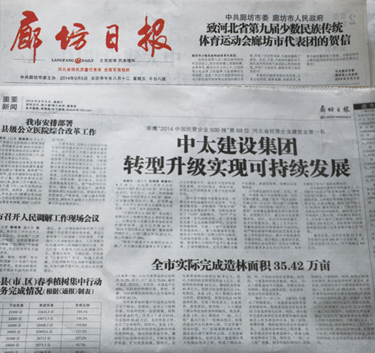 9月5日廊坊日報報道了中太建設集團轉型升級實現(xiàn)可持續(xù)發(fā)展