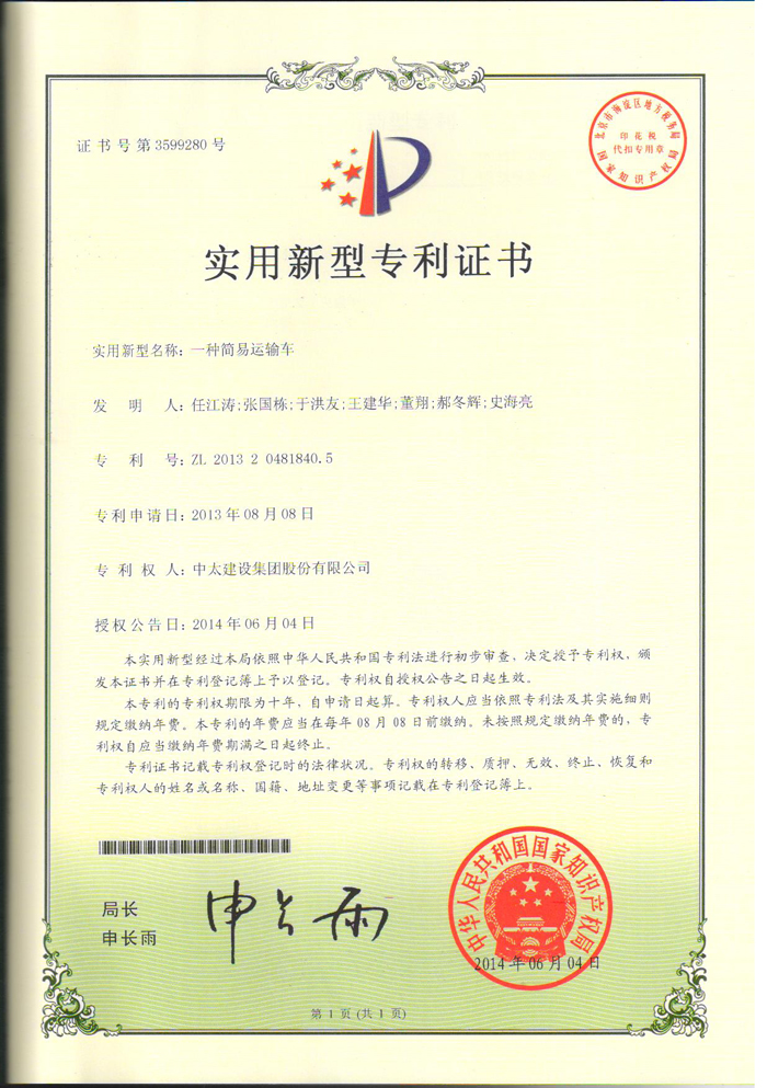 集團公司再獲一項實用新型專利《一種簡易運輸車》。至此,集團公司已累計獲得國家專利十五項,其中發(fā)明專利五項,實用新型十項。(企業(yè)技術中心 董翔)