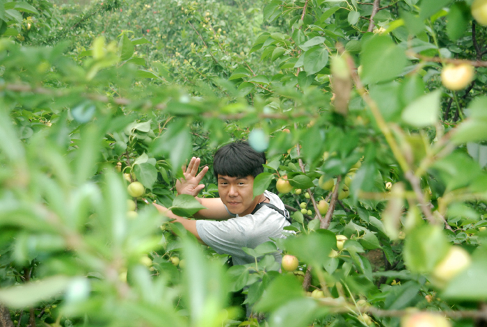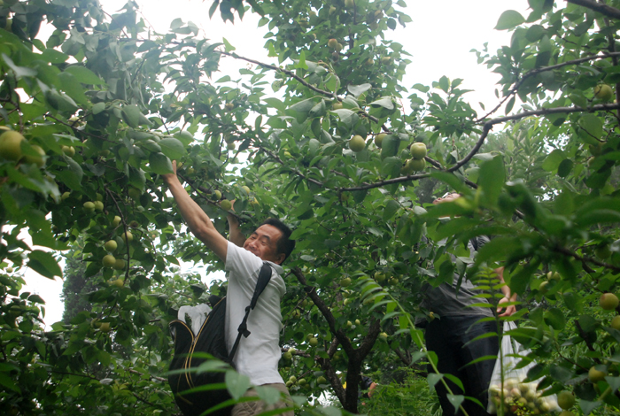 盡管空氣潮濕,路面濕滑,但阻擋不了大家采摘的熱情。面對著綴滿枝頭的杏兒,大家早就沒有平日里的文雅和羞澀,翹腳、彎枝,瞄準(zhǔn)了那大個地、泛著紅暈的京白杏兒,熟練地采摘。