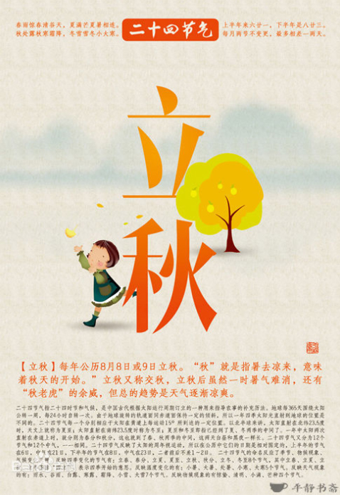 今天是立秋,意味著夏季的結(jié)束,秋季的開(kāi)始,氣溫逐漸下降,雨水逐漸減少。我國(guó)幅員遼闊,就節(jié)氣而言不可能同時(shí)進(jìn)入涼爽的秋季的,是有一些差別的。生活在廊坊這個(gè)地方,四季分明的氣候,是老天恩賜的福分。不冷不熱的天,氣候宜人,真正是秋高氣爽。我國(guó)古代將秋季劃分為三候:一候涼風(fēng)至,二候白露生,三候寒蟬鳴。是說(shuō)立秋后刮風(fēng)人們會(huì)感到?jīng)鏊,大地早晨?huì)有霧氣產(chǎn)生,并且秋天感陰而鳴的寒蟬也開(kāi)始鳴叫。民間流行“貼秋膘”,就是在立秋這天吃些美味佳肴,老百姓家就是燉肉、包餃子。